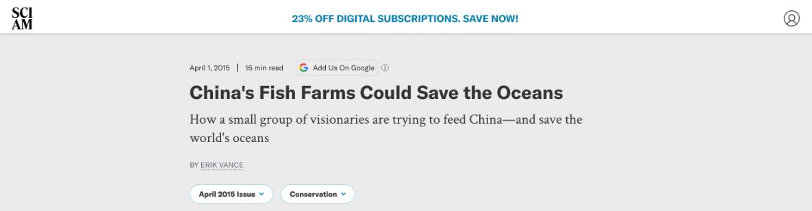 “中国的水产养殖可以拯救世界海洋。”这句话并非中国科学家的自我评价,而是2015年由国际专家发表在Scientific American(《科学美国人》)的一篇评述文章标题。